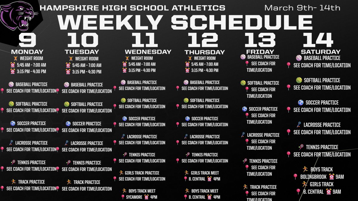 This Weeks Schedule! Unfortunately with the weather, events are subject to change. Please make sure you are communicating with your coach about practice times and event changes. Please also refer to https://www.foxvalleyconference.org/public/genie/981/school/16/ for updates! ...